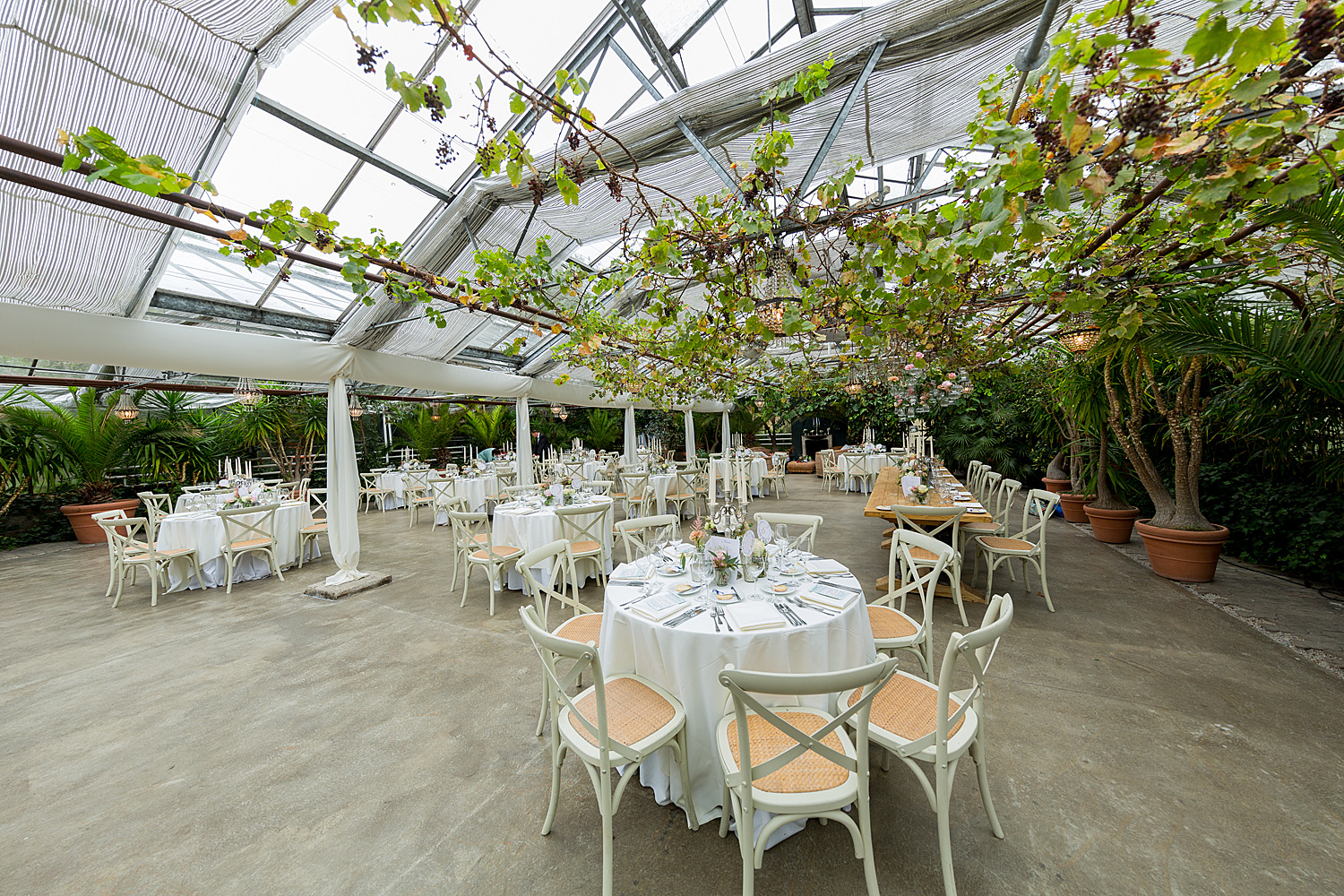 Im mit Blumen und Pflanzen üppig geschmückten Gewächshaus fand zunächst die freie Trauung statt. Zu John Legends „All of me“ führte Susannes Vater die Braut in ihrem wunderschönen Hochzeitskleid von Rosa Clara zum Traualtar. Dort hielt Traurednerin Tina Tschage die berührende Zeremonie ab. Anschließend ging es für die ca. 85 Gäste zunächst zu einem Nachmittagsempfang und danach zur Feier in das große Gewächshaus.